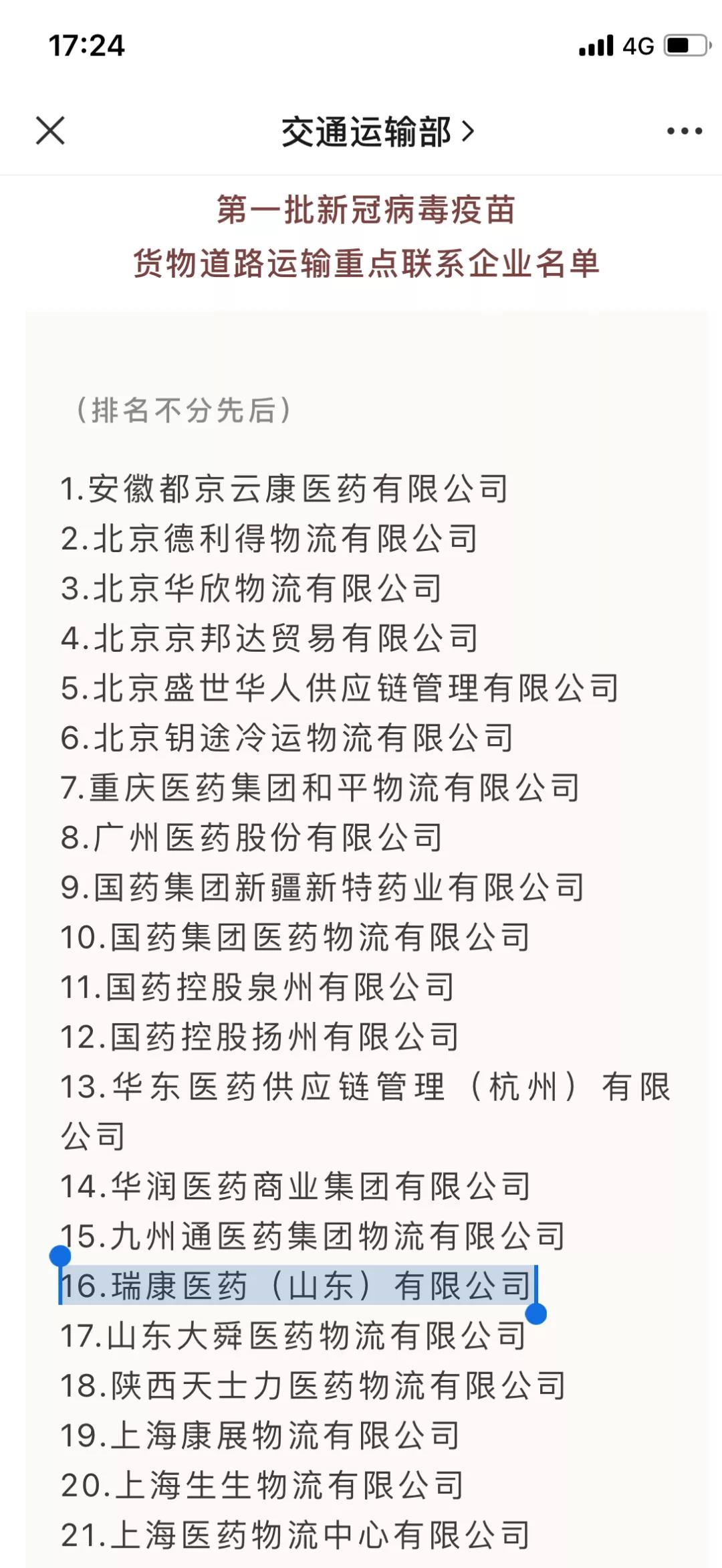 888集团医药(山东)有限公司入选交通部 “第一批新冠疫苗运输企业公示”名单