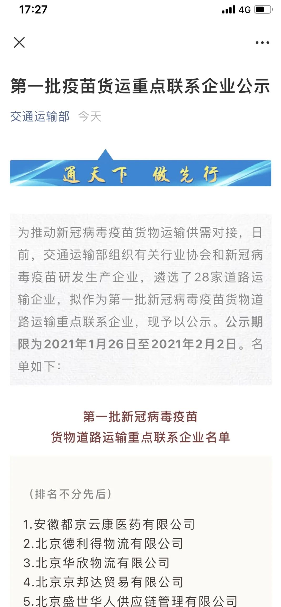 公司将严格遵守交通运输部下发的《新冠病毒疫苗货物道路运输技术指南》的要求,标准化运营、合规化操作、统一化管理,为抗击新冠疫情尽到医药物流人的责任与使命。